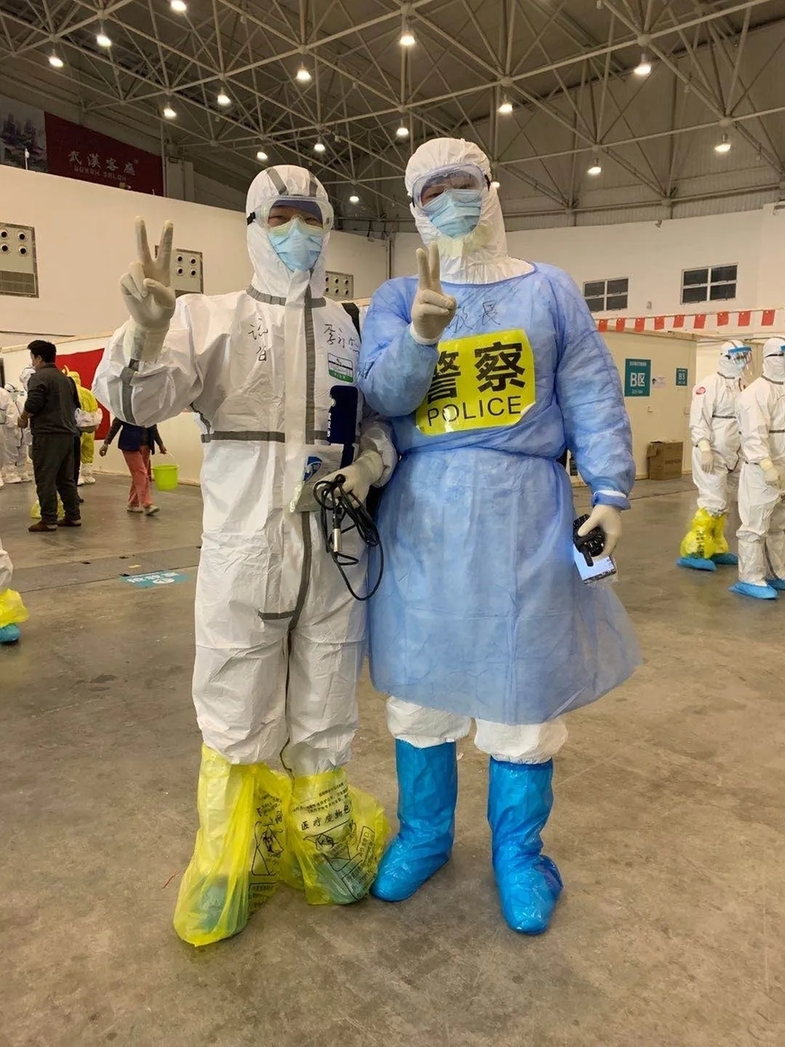 武漢廣播電視臺(tái)新聞?lì)l道深度資訊部記者李永杰(左)在武漢客廳方艙醫(yī)院病區(qū)內(nèi)偶遇東西湖區(qū)交通大隊(duì)漢警快騎隊(duì)民警張敬畏。
