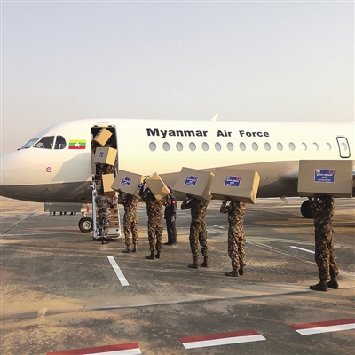 2月25日清晨迎著朝陽,緬甸國(guó)防軍使用空軍飛機(jī)運(yùn)送N95級(jí)別口罩、護(hù)目鏡、防護(hù)服等醫(yī)療捐助物資前往中國(guó),旨在幫助中國(guó)抗擊新冠肺炎疫情,緬甸國(guó)防軍總參謀長(zhǎng)妙通烏上將、駐緬甸大使陳海、使館武官熊韶?zé)樀仍趦?nèi)比都機(jī)場(chǎng)送行。光明日?qǐng)?bào)駐仰光記者鹿鋮攝/光明圖片