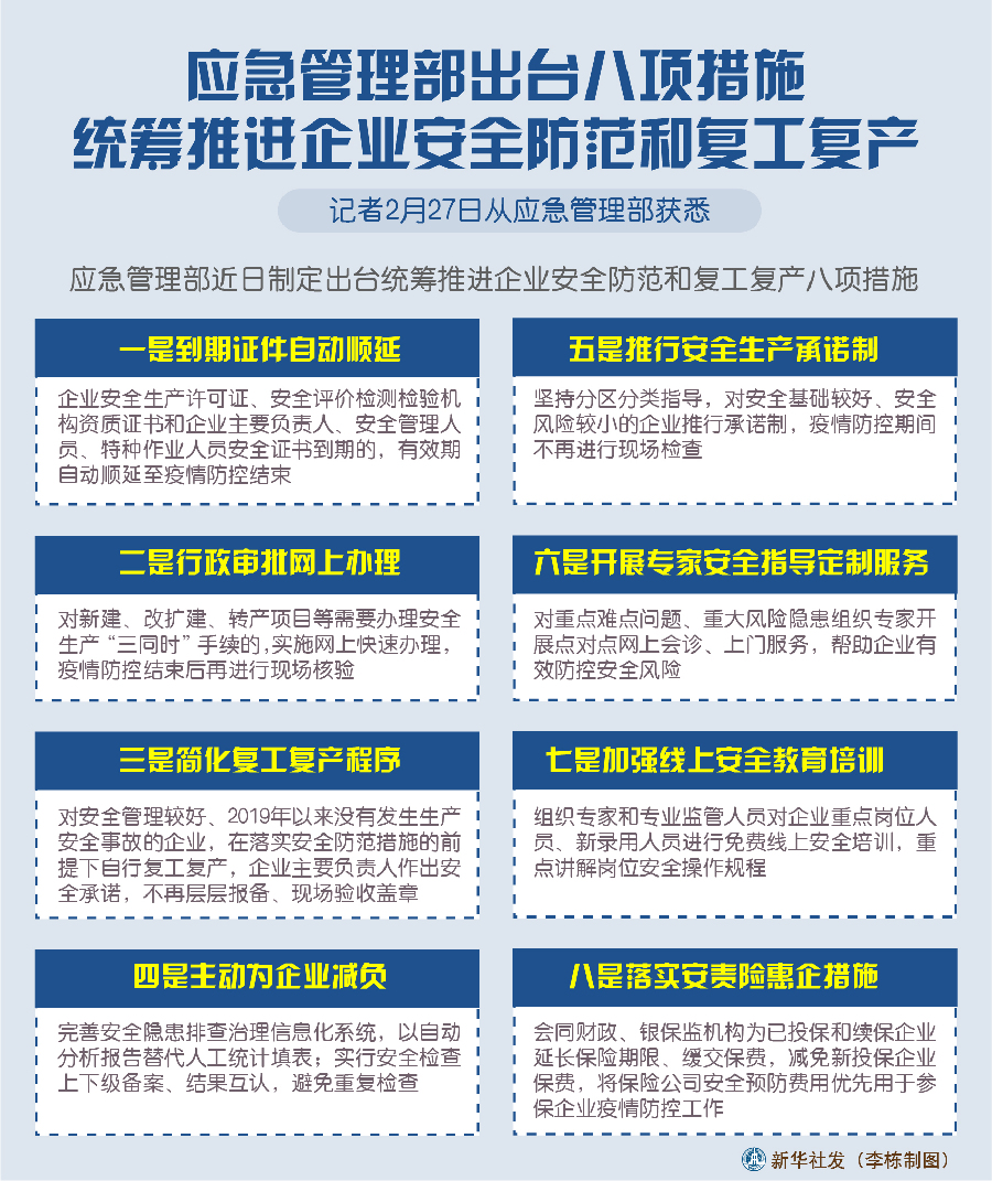 圖表:應(yīng)急管理部出臺八項(xiàng)措施 統(tǒng)籌推進(jìn)企業(yè)安全防范和復(fù)工復(fù)產(chǎn) 新華社發(fā) 李棟 制圖