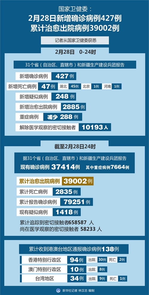 截至2月28日24時,據(jù)31個?。ㄗ灾螀^(qū)、直轄市)和新疆生產(chǎn)建設(shè)兵團報告,現(xiàn)有確診病例37414例(其中重癥病例7664例),累計治愈出院病例39002例,累計死亡病例2835例,累計報告確診病例79251例,現(xiàn)有疑似病例1418例。累計追蹤到密切接觸者658587人,尚在醫(yī)學觀察的密切接觸者58233人。