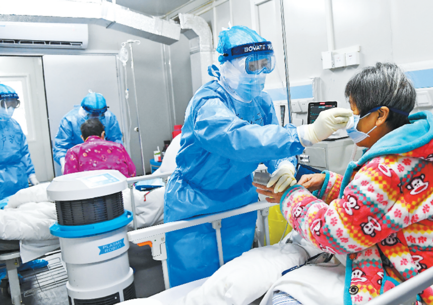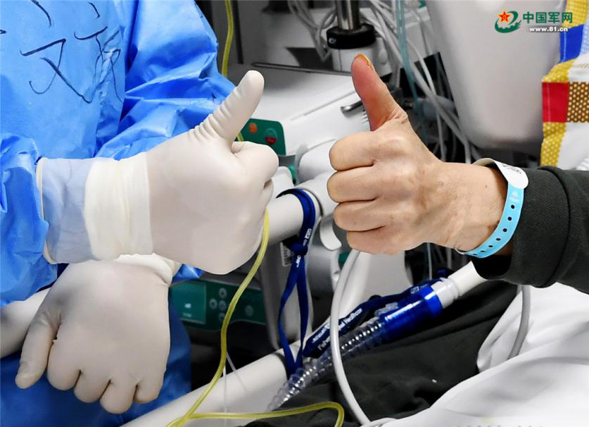 火神山醫(yī)院重癥醫(yī)學一科自2月10日開始收治重癥患者以來,全科醫(yī)護人員不畏風險全力救治,他們根據(jù)患者病情的變化,有預見性地快速調(diào)整救治方案,采取呼吸支持、抗病毒、維護臟器功能、加強營養(yǎng)等方法,使重癥患者逐漸有了好轉,提高了救治成功率。互相鼓勵點贊,是在重癥室看到最多的場景。解放軍報記者王傳順 攝