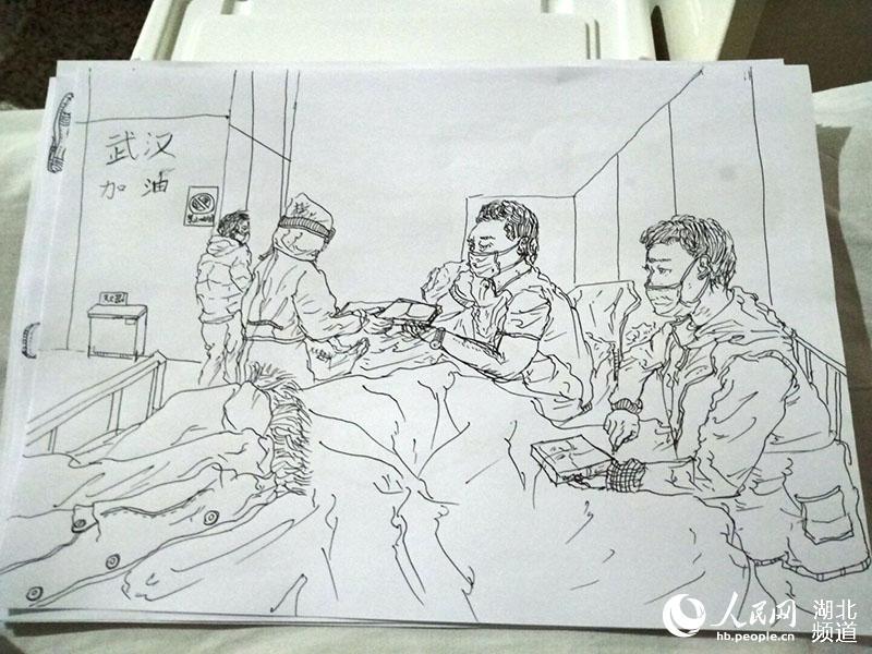 “被照顧得很好”的小彭常??吹结t(yī)護人員們穿著厚重的防護服,一忙就是6個小時以上不停歇,連水和飯都得換班以后吃,卻每天依然為患者提供無微不至的照顧。出于感動和感激,彭昕燁向醫(yī)護人員借了紙和筆,將方艙醫(yī)院溫暖的瞬間畫成素描。