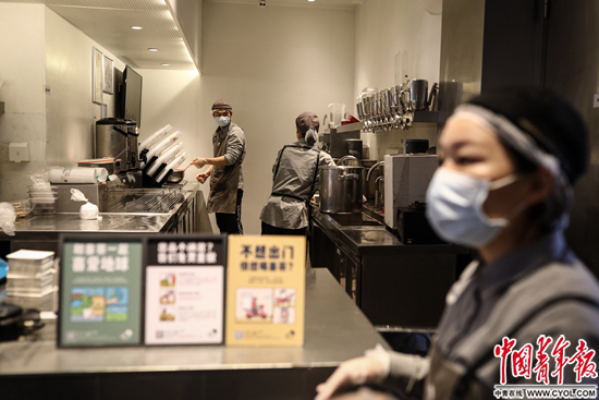 喜茶漢街LAB店和大多數(shù)店鋪一樣暫停營業(yè)了。2月22日,中青報(bào)·中青網(wǎng)記者實(shí)地探訪時(shí)發(fā)現(xiàn),空空蕩蕩的店鋪里擺著一排排裝滿食物的紙袋,10名工作人員戴著口罩,如往常一樣在忙碌地制作奶茶和面包。