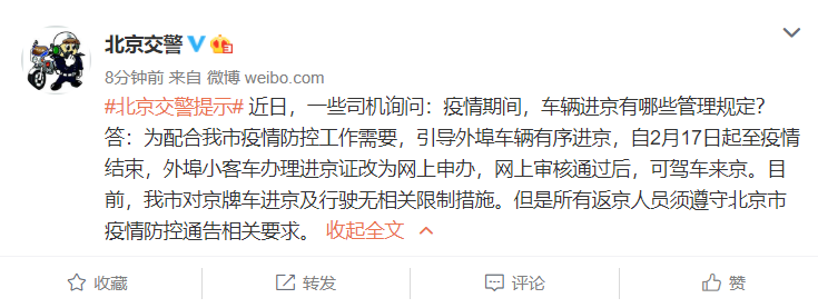 據(jù)北京市公安局公安交通管理局官方微博3月4日消息,近日,一些司機(jī)詢問(wèn):疫情期間,車(chē)輛進(jìn)京有哪些管理規(guī)定?答:為配合我市疫情防控工作需要,引導(dǎo)外埠車(chē)輛有序進(jìn)京,自2月17日起至疫情結(jié)束,外埠小客車(chē)辦理進(jìn)京證改為網(wǎng)上申辦,網(wǎng)上審核通過(guò)后,可駕車(chē)來(lái)京。目前,我市對(duì)京牌車(chē)進(jìn)京及行駛無(wú)相關(guān)限制措施。但是所有返京人員須遵守北京市疫情防控通告相關(guān)要求。
