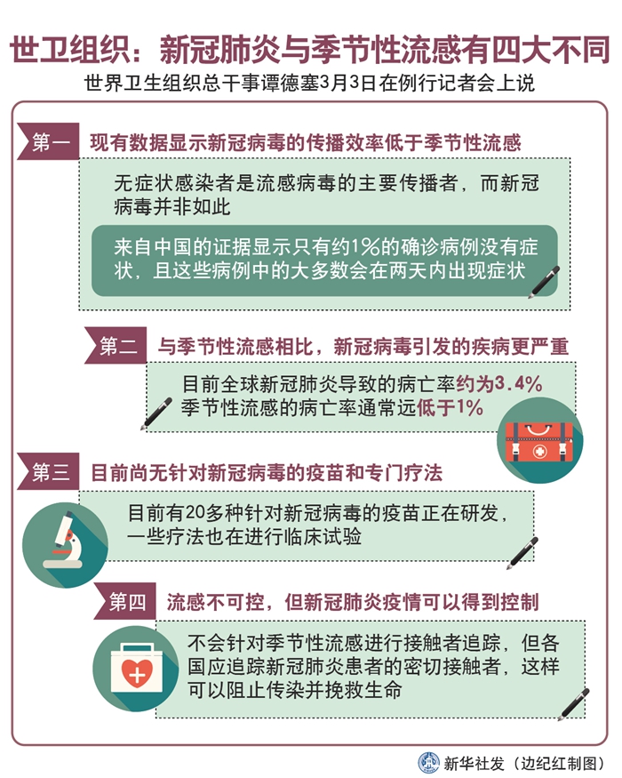 世界衛(wèi)生組織總干事譚德塞3日在例行記者會(huì)上說(shuō),世衛(wèi)組織正在加深對(duì)新冠肺炎的認(rèn)識(shí),并發(fā)現(xiàn)它與季節(jié)性流感存在4個(gè)重要區(qū)別。