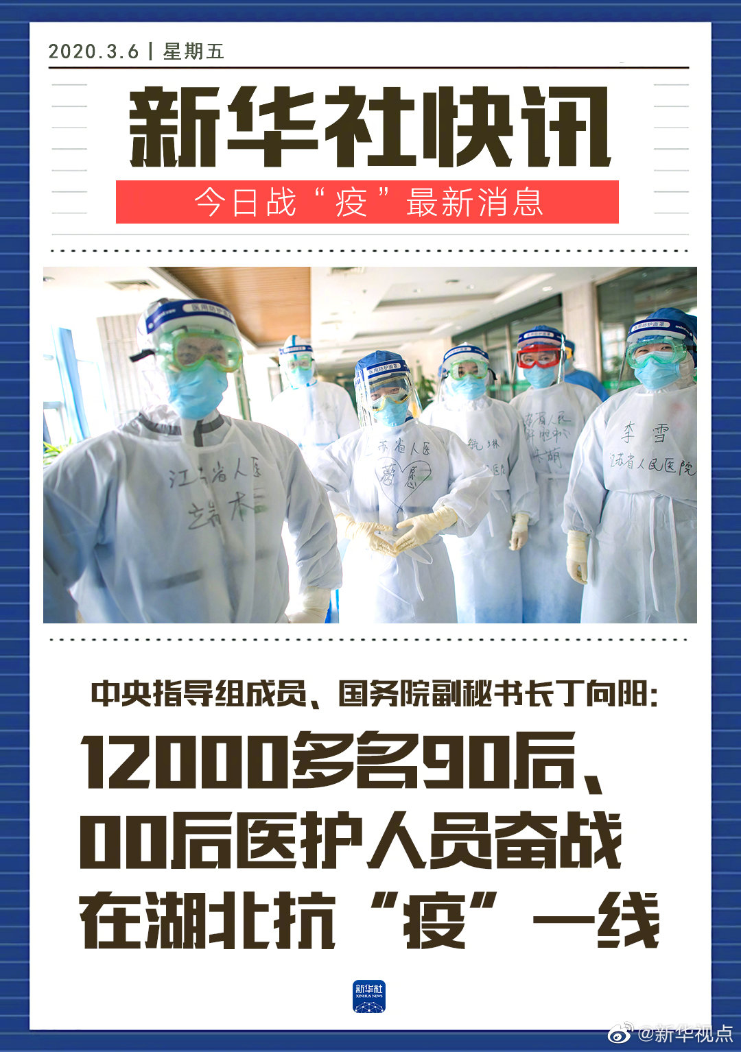 中央指導(dǎo)組成員、國(guó)務(wù)院副秘書(shū)長(zhǎng)丁向陽(yáng)在武漢舉行的國(guó)務(wù)院新聞發(fā)布會(huì)上說(shuō),在全國(guó)4萬(wàn)多名支援湖北醫(yī)務(wù)人員中,有12000多名90后、00后的年輕人,他們用行動(dòng)證明了自己的責(zé)任、擔(dān)當(dāng)和價(jià)值。昨天父母眼中的孩子,今天已然成為新時(shí)代共和國(guó)的脊梁,成為了國(guó)家的希望。(記者秦交鋒、王作葵、李偉)