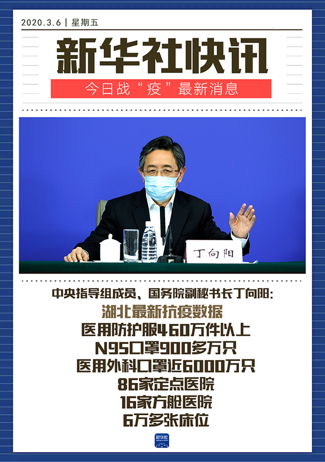 國務(wù)院新聞辦公室3月6日在湖北武漢舉行新聞發(fā)布會,請中央指導(dǎo)組成員、國務(wù)院副秘書長丁向陽,中央指導(dǎo)組成員、工業(yè)和信息化部副部長王江平,中央指導(dǎo)組成員、國家衛(wèi)生健康委黨組成員、中醫(yī)藥局黨組書記余艷紅介紹新冠肺炎疫情防控救治進(jìn)展情況,并答記者問。