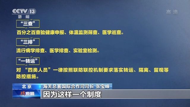海關總署國際合作司司長 張寶峰:“三查”“三排”“一轉(zhuǎn)運”是我們海關多年來摸索探索形成的一個比較成熟的、規(guī)范的應對重大國外疫情傳入的制度模式。運行這個模式,主要有三個方面,第一就是海關的執(zhí)行,海關在執(zhí)行方面我們是非常有信心的。
