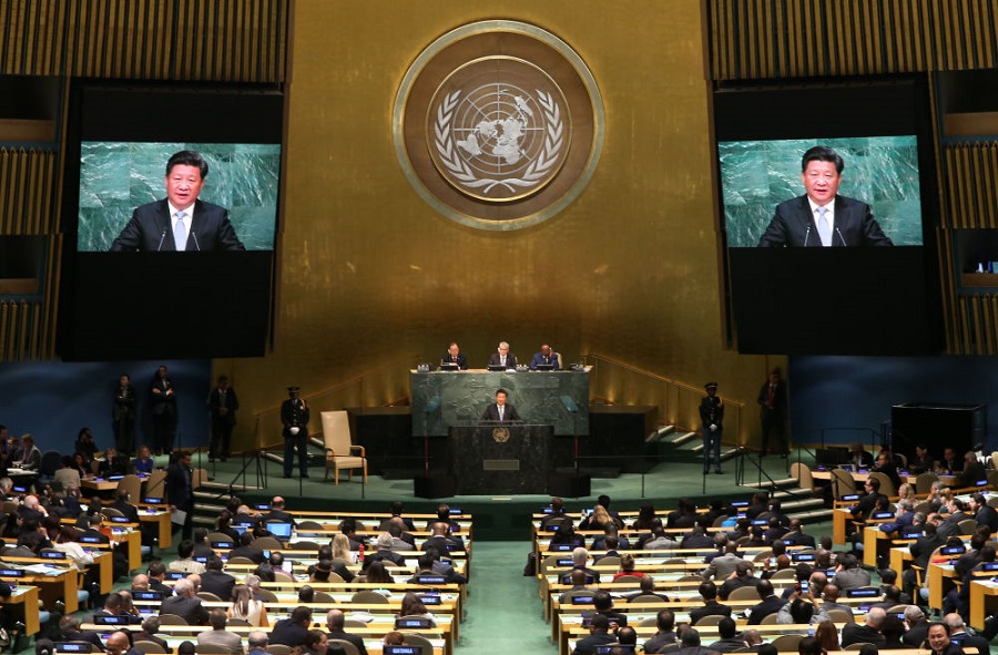 2015年9月28日,國(guó)家主席習(xí)近平在紐約聯(lián)合國(guó)總部出席第70屆聯(lián)合國(guó)大會(huì)一般性辯論并發(fā)表題為《攜手構(gòu)建合作共贏新伙伴 同心打造人類命運(yùn)共同體》的重要講話。新華社記者龐興雷攝