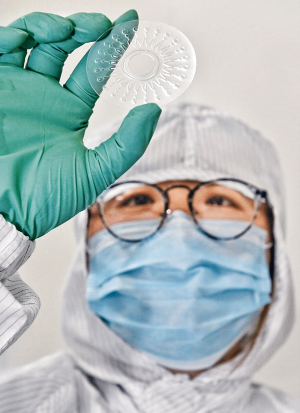 由國內(nèi)幾家科研機(jī)構(gòu)聯(lián)合攻關(guān)開發(fā)的包括新冠病毒在內(nèi)的呼吸道病毒(6種)核酸檢測(cè)試劑盒(恒溫?cái)U(kuò)增芯片法),只需采集患者的鼻、咽拭子等分泌物樣本,在1.5小時(shí)內(nèi)便可一次性檢測(cè)包括新冠病毒在內(nèi)的6種呼吸道病毒。圖為科技人員在展示恒溫?cái)U(kuò)增芯片。新華社記者 劉坤/攝