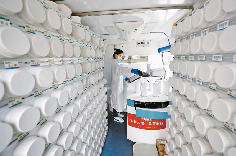在武漢江夏方艙醫(yī)院的“流動(dòng)應(yīng)急智能中藥房”里,工作人員把盛有藥方中包含的單味藥的藥瓶取下來后,逐一掃描確認(rèn),準(zhǔn)備制藥。新華社記者 沈伯韓/攝