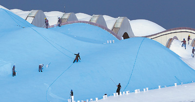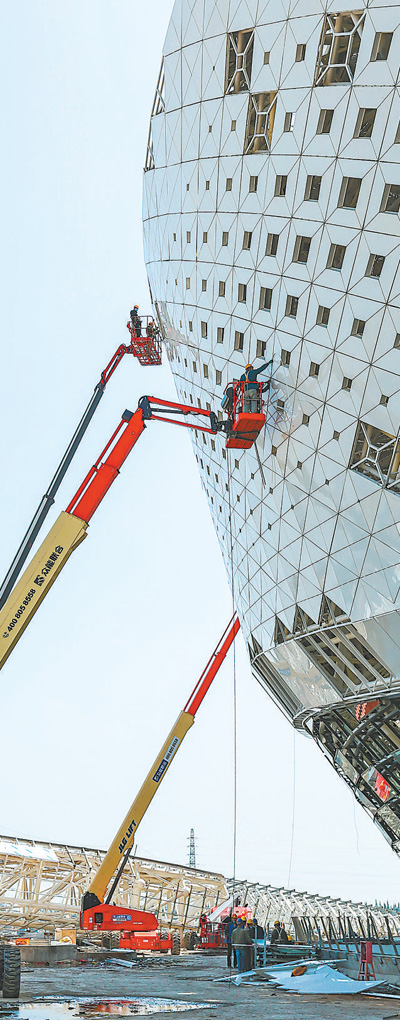3月15日,第十八屆世界中學(xué)生運(yùn)動(dòng)會(huì)主會(huì)場(chǎng)福建晉江市第二體育中心各個(gè)場(chǎng)館及室外工程均已全部復(fù)工。圖為工人在進(jìn)行主場(chǎng)館外立面施工。邵玉姿 董嚴(yán)軍攝影報(bào)道