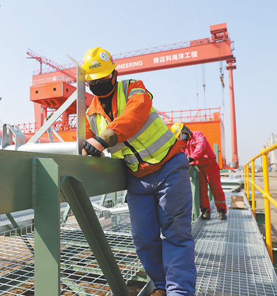 3月11日,在天津港大沽口港區(qū),工人正在加緊組裝海上油氣工程模塊。龔相娟 李宇光攝影報(bào)道