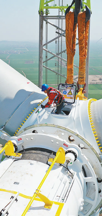 3月15日,在安徽省亳州市蒙城縣,華能風(fēng)電項(xiàng)目復(fù)工后的第七臺(tái)風(fēng)機(jī)順利吊裝。胡衛(wèi)國(guó)攝(影像中國(guó))