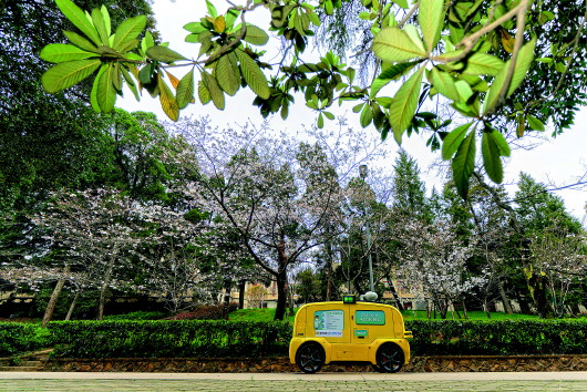 ▲一輛5G無人攝像車在武漢大學(xué)櫻花大道進(jìn)行不間斷無人巡游,實(shí)時(shí)采集和傳輸直播圖像信號(hào)。(3月16日攝) 新華社記者費(fèi)茂華攝