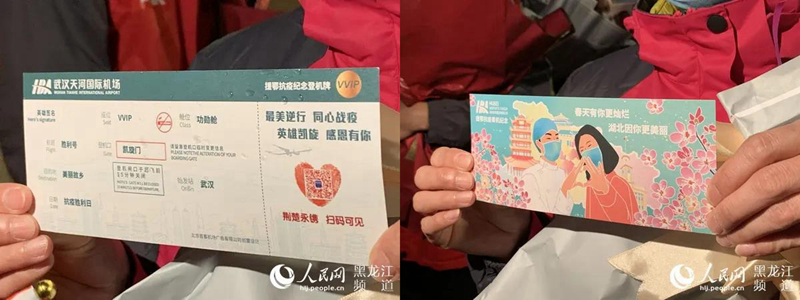 公寶霞是黑龍江省第五批援鄂醫(yī)療隊(duì)隊(duì)員,作為首批凱旋回鄉(xiāng)的醫(yī)護(hù)人員,她格外興奮?!澳康牡貙?xiě)著‘美麗的故鄉(xiāng)’,航班號(hào)是‘勝利號(hào)’,艙位是‘功勛艙’?!惫珜毾颊f(shuō),這是武漢天河機(jī)場(chǎng)專(zhuān)門(mén)為他們準(zhǔn)備的紀(jì)念登機(jī)牌,特別有意義。