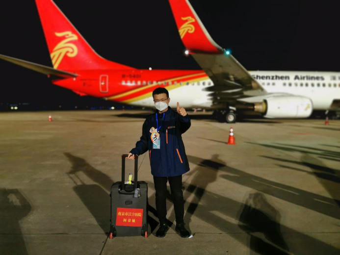 3月17日晚,柯章敏結(jié)束50多天的支援,從武漢乘坐飛機(jī)抵達(dá)南京祿口機(jī)場(chǎng)。受訪(fǎng)者供圖