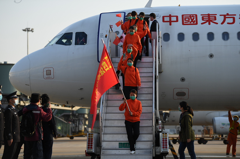新疆生產(chǎn)建設(shè)兵團(tuán)支援湖北醫(yī)療隊(duì)抵達(dá)烏魯木齊機(jī)場(chǎng)。陳新輝攝