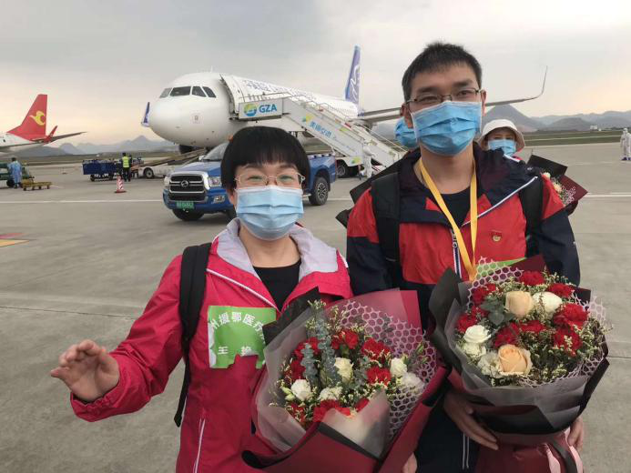 3月6日,漢江方艙醫(yī)院正式休艙;3月17日,王艷所在的醫(yī)療隊(duì)接到了可以撤離的通知。3月18日中午11點(diǎn),乘坐“勝利號(hào)”航班返黔的王艷平安到達(dá)貴陽(yáng)龍洞堡機(jī)場(chǎng)。家鄉(xiāng)人民的熱情歡迎讓她數(shù)次感動(dòng)落淚,“病毒雖然可怕,但患者的信任和家鄉(xiāng)的支持,就是我們的能量來(lái)源。”