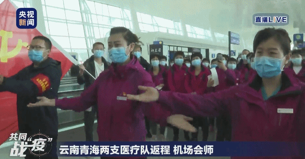 唱響《歌唱祖國(guó)》的兩支隊(duì)伍是云南第七批支援武漢醫(yī)療隊(duì)和青海第一批支援武漢醫(yī)療隊(duì)。合唱結(jié)束,兩隊(duì)隊(duì)員還唱起了家鄉(xiāng)民歌,跳起《聽(tīng)我說(shuō)謝謝你》的舞蹈。