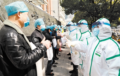3月14日,武漢市第七醫(yī)院醫(yī)療團(tuán)隊(duì)向最后一批治愈出院患者送上禮物和祝福。 本報(bào)記者 周 琳攝