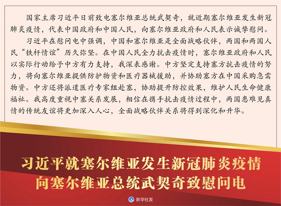 習(xí)近平在慰問(wèn)電中強(qiáng)調(diào),中國(guó)和塞爾維亞是全面戰(zhàn)略伙伴,兩國(guó)和兩國(guó)人民“鐵桿情誼”歷久彌堅(jiān)。在中國(guó)人民全力抗擊疫情時(shí),塞爾維亞政府和人民以實(shí)際行動(dòng)給予中方有力支持,我深表感謝。中方堅(jiān)定支持塞方抗擊疫情的努力,將向塞爾維亞提供防護(hù)物資和醫(yī)療器械援助,并協(xié)助塞方在中國(guó)采購(gòu)急需物資。中方還將派遣醫(yī)療專家組赴塞,協(xié)助提升防控效果,維護(hù)人民生命健康福祉。我高度重視中塞關(guān)系發(fā)展,相信在攜手抗擊疫情過(guò)程中,兩國(guó)患難見(jiàn)真情的傳統(tǒng)友誼將更加深入人心,全面戰(zhàn)略伙伴關(guān)系將得到深化和升華。