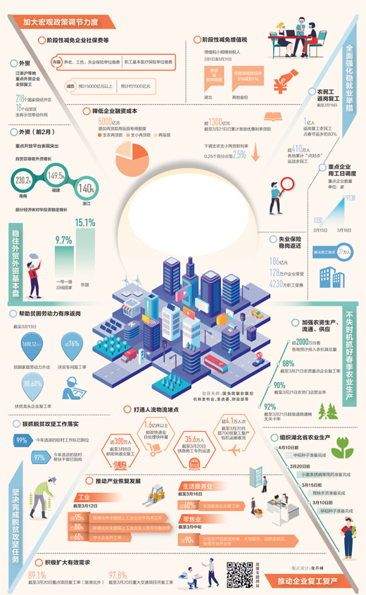 一個月以來,各地各部門分區(qū)分級精準復工復產(chǎn),圍繞中小微企業(yè)、農(nóng)民工、高校畢業(yè)生、外商等出臺針對性措施,加大支持力度。本版推出數(shù)據(jù)可視化融媒體報道,展現(xiàn)生產(chǎn)生活秩序加快恢復的態(tài)勢和積極成效。