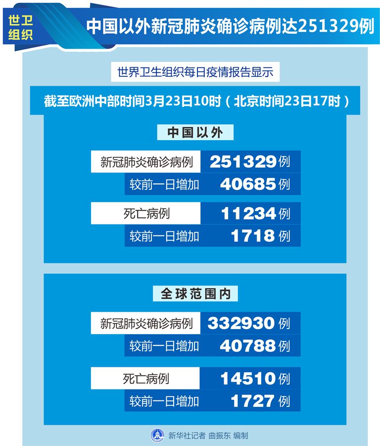 新華社日內瓦3月23日電(記者劉曲)世界衛(wèi)生組織23日公布的最新數(shù)據(jù)顯示,中國以外新冠肺炎確診病例達到251329例。