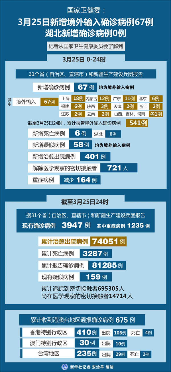 截至3月25日24時(shí),據(jù)31個(gè)?。ㄗ灾螀^(qū)、直轄市)和新疆生產(chǎn)建設(shè)兵團(tuán)報(bào)告,現(xiàn)有確診病例3947例(其中重癥病例1235例),累計(jì)治愈出院病例74051例,累計(jì)死亡病例3287例,累計(jì)報(bào)告確診病例81285例,現(xiàn)有疑似病例159例。累計(jì)追蹤到密切接觸者695305人,尚在醫(yī)學(xué)觀察的密切接觸者14714人。