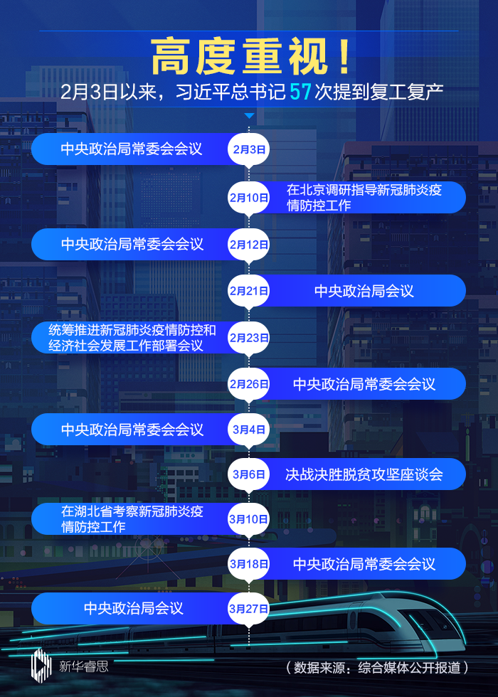 數(shù)據(jù)顯示,自2月3日以來(lái),習(xí)近平在不同場(chǎng)合共提到了復(fù)工復(fù)產(chǎn)57次,足見(jiàn)總書記對(duì)復(fù)工復(fù)產(chǎn)工作的重視和關(guān)注。