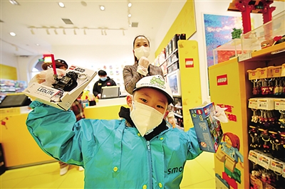 3月30日,武漢市楚河漢街重新開街,多家主力商鋪率先營業(yè)。圖為一位小朋友在家長的帶領(lǐng)下購買心儀的玩具。光明日報武漢一線報道組記者蔡闖、季春紅攝/光明圖片