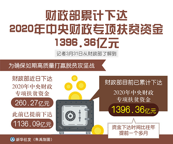 新華社北京3月31日電(記者申鋮)記者31日從財政部了解到,為確保如期高質量打贏脫貧攻堅戰(zhàn),財政部目前已累計下達2020年中央財政專項扶貧資金1396.36億元,資金下達時間比往年提前一個多月。