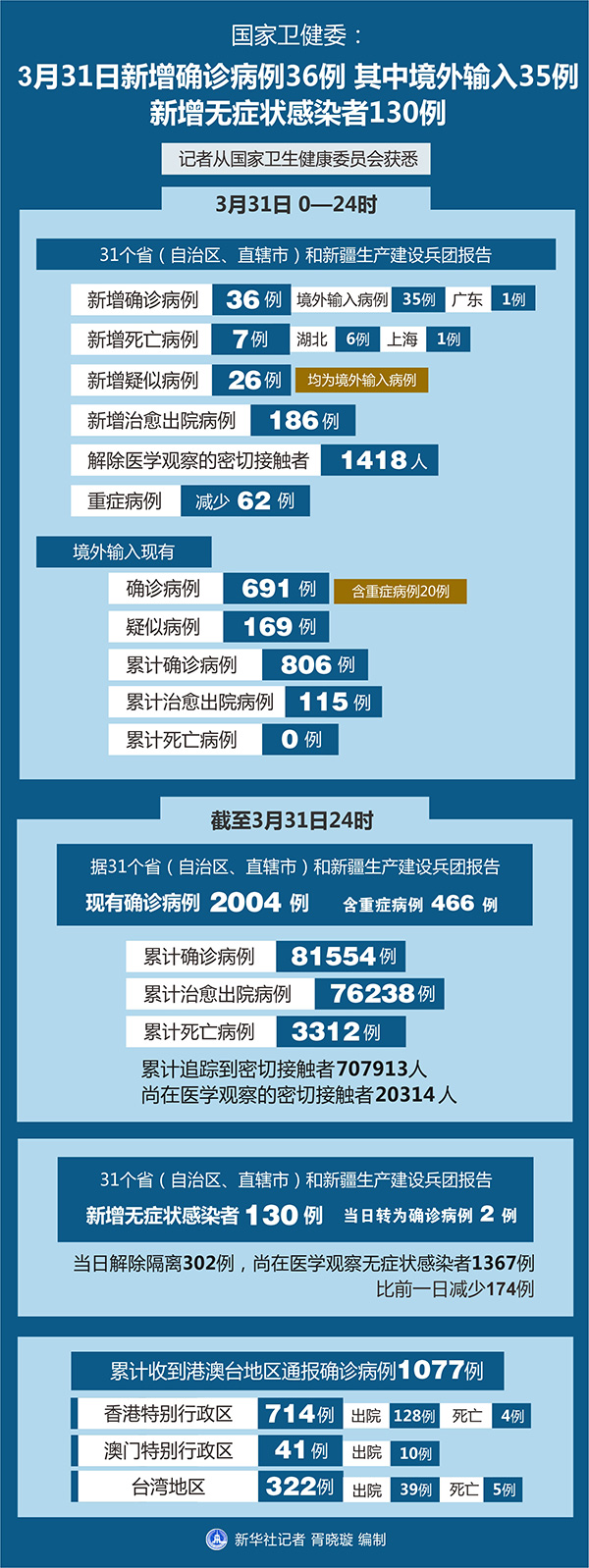 截至3月31日24時,據(jù)31個?。ㄗ灾螀^(qū)、直轄市)和新疆生產(chǎn)建設(shè)兵團報告,現(xiàn)有確診病例2004例(含重癥病例466例),現(xiàn)有疑似病例172例。累計確診病例81554例,累計治愈出院病例76238例,累計死亡病例3312例,累計追蹤到密切接觸者707913人,尚在醫(yī)學觀察的密切接觸者20314人。