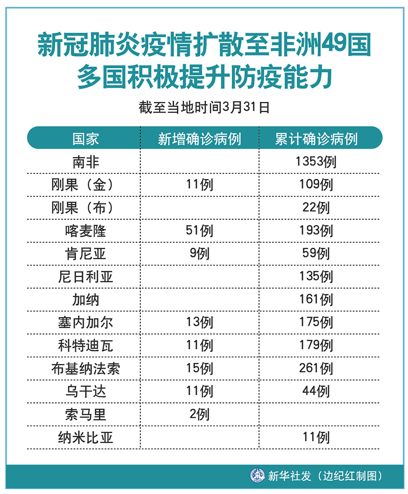 截至31日,剛果(金)新增確診病例11例,累計109例;剛果(布)累計22例;喀麥隆新增51例,累計193例;肯尼亞新增9例,累計59例;尼日利亞累計135例;加納累計161例;塞內(nèi)加爾新增13例,累計175例;科特迪瓦新增11例,累計179例;布基納法索新增15例,累計261例;烏干達新增11例,累計44例;索馬里新增2例;納米比亞累計11例。