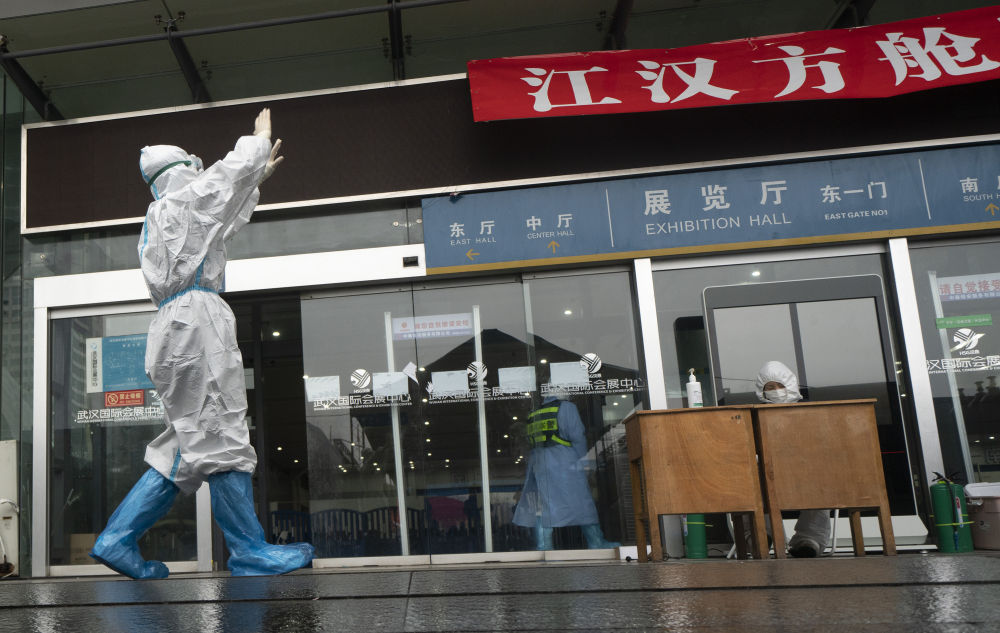 ↑3月9日,最后一位走出江漢方艙醫(yī)院的醫(yī)護(hù)人員、武漢協(xié)和醫(yī)院醫(yī)生逯翀向方艙醫(yī)院揮手告別。