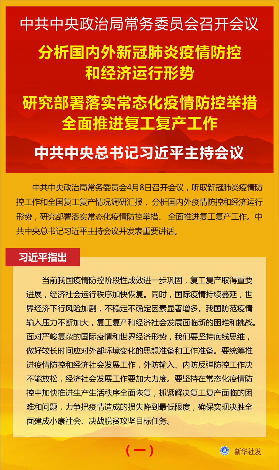 中共中央政治局常務(wù)委員會(huì)召開(kāi)會(huì)議 分析國(guó)內(nèi)外新冠肺炎疫情防控和經(jīng)濟(jì)運(yùn)行形勢(shì) 研究部署落實(shí)常態(tài)化疫情防控舉措全面推進(jìn)復(fù)工復(fù)產(chǎn)工作 中共中央總書(shū)記習(xí)近平主持會(huì)議