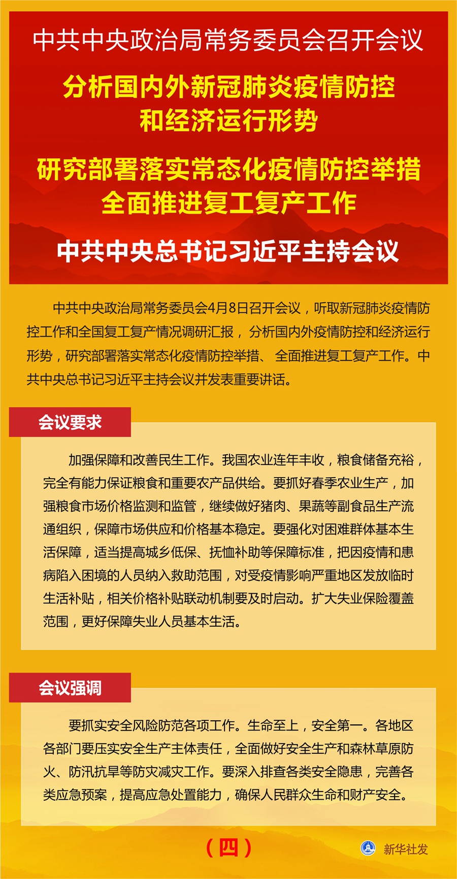 中共中央政治局常務(wù)委員會(huì)召開(kāi)會(huì)議 分析國(guó)內(nèi)外新冠肺炎疫情防控和經(jīng)濟(jì)運(yùn)行形勢(shì) 研究部署落實(shí)常態(tài)化疫情防控舉措全面推進(jìn)復(fù)工復(fù)產(chǎn)工作 中共中央總書(shū)記習(xí)近平主持會(huì)議