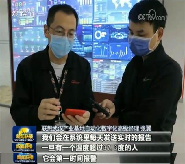 這里是聯(lián)想武漢產(chǎn)業(yè)基地,目前復工復產(chǎn)率已達到100%,所有返崗員工都需持有健康證明,在工作區(qū)域每隔4小時就有網(wǎng)格員來測量體溫。此外,企業(yè)還專門開發(fā)了數(shù)字化防疫系統(tǒng),對在崗員工健康狀況進行精準管理。