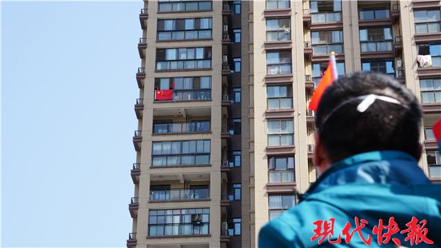 居民窗邊掛五星紅旗送行