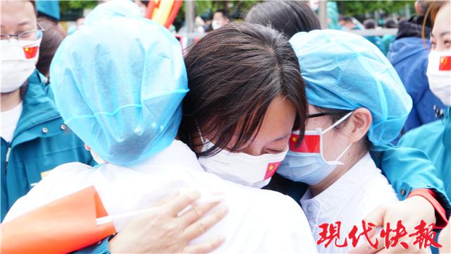 撤離前一天,北京協(xié)和醫(yī)療隊前往同濟醫(yī)院中法新城院區(qū)拍攝合影。共同戰(zhàn)疫多日,讓醫(yī)療隊員與武漢的醫(yī)護人員結(jié)下深厚友誼。他們互贈禮物,約定明年來武漢看櫻花。臨別時,戰(zhàn)友們抱在一起,留下熱淚。