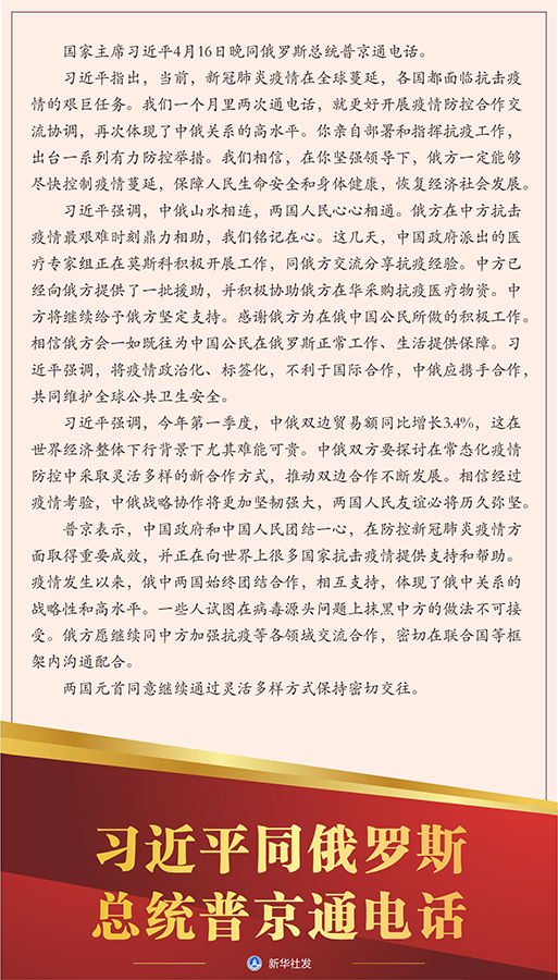 習(xí)近平強(qiáng)調(diào),中俄山水相連,兩國人民心心相通。俄方在中方抗擊疫情最艱難時(shí)刻鼎力相助,我們銘記在心。這幾天,中國政府派出的醫(yī)療專家組正在莫斯科積極開展工作,同俄方交流分享抗疫經(jīng)驗(yàn)。中方已經(jīng)向俄方提供了一批援助,并積極協(xié)助俄方在華采購抗疫醫(yī)療物資。中方將繼續(xù)給予俄方堅(jiān)定支持。感謝俄方為在俄中國公民所做的積極工作。相信俄方會(huì)一如既往為中國公民在俄羅斯正常工作、生活提供保障。習(xí)近平強(qiáng)調(diào),將疫情政治化、標(biāo)簽化,不利于國際合作,中俄應(yīng)攜手合作,共同維護(hù)全球公共衛(wèi)生安全。