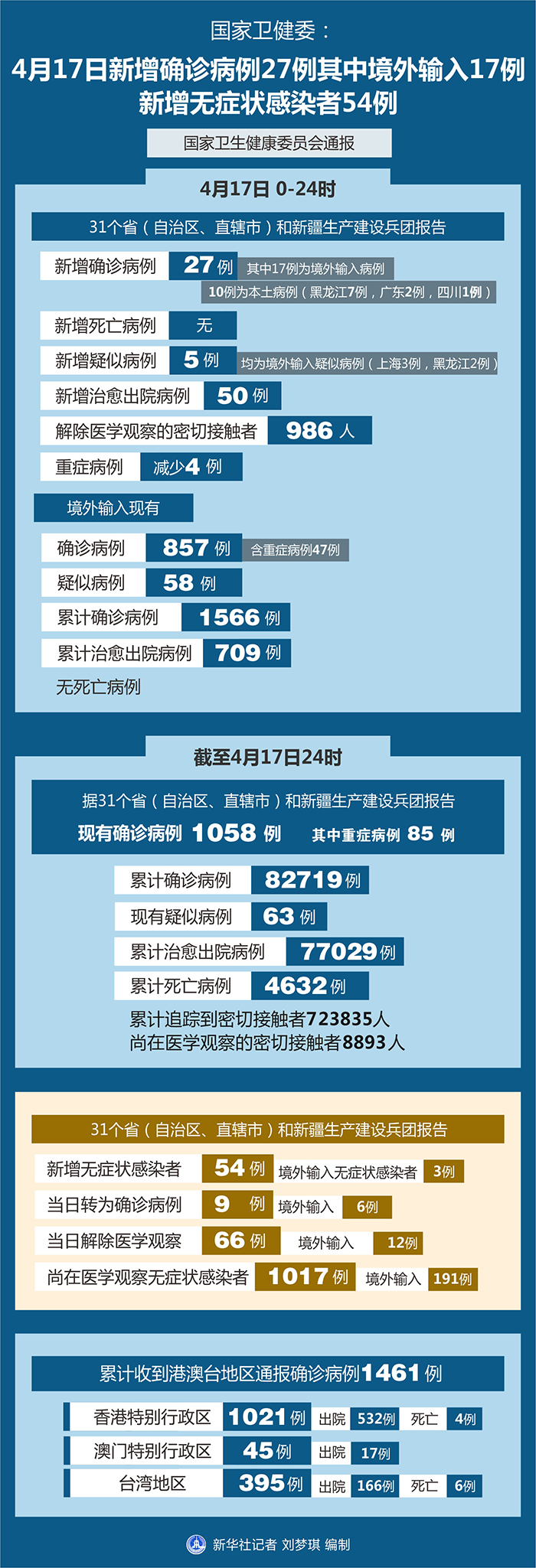 截至4月17日24時(shí),據(jù)31個(gè)?。ㄗ灾螀^(qū)、直轄市)和新疆生產(chǎn)建設(shè)兵團(tuán)報(bào)告,現(xiàn)有確診病例1058例(其中重癥病例85例),累計(jì)治愈出院病例77029例,累計(jì)死亡病例4632例,累計(jì)報(bào)告確診病例82719例,現(xiàn)有疑似病例63例。累計(jì)追蹤到密切接觸者723835人,尚在醫(yī)學(xué)觀察的密切接觸者8893人。