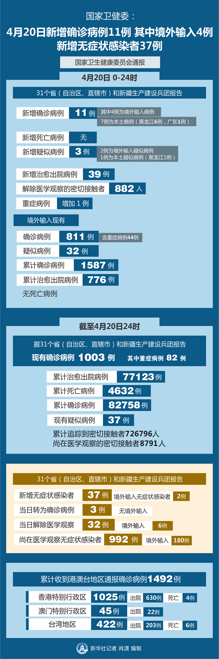截至4月20日24時,據31個?。ㄗ灾螀^(qū)、直轄市)和新疆生產建設兵團報告,現(xiàn)有確診病例1003例(其中重癥病例82例),累計治愈出院病例77123例,累計死亡病例4632例,累計報告確診病例82758例,現(xiàn)有疑似病例37例。累計追蹤到密切接觸者726797人,尚在醫(yī)學觀察的密切接觸者8791人。
