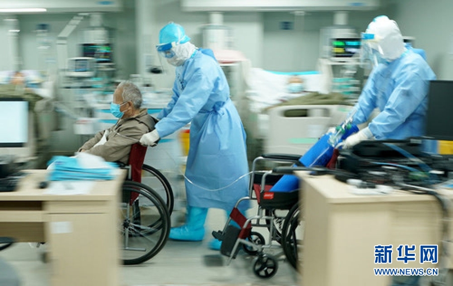 3月20日,武漢火神山醫(yī)院重癥醫(yī)學(xué)一科副主任宋立強(qiáng)(中)護(hù)送81歲的新冠肺炎重癥患者去做CT檢查。為確保患者有充足供氧,醫(yī)生胡世頡推著氧氣瓶隨行。新華社記者 王毓國 攝
