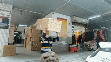 一小時后,一輛貨車駛進狹窄的街區(qū),停在十幾米遠外。冉光輝瞬間抖擻起精神,移下一個近半人高的箱子放到左邊肩頭,兩臂環(huán)抱貨物,小跑著往車上運送。專職做“棒棒”多年,這一套程序他再熟悉不過。