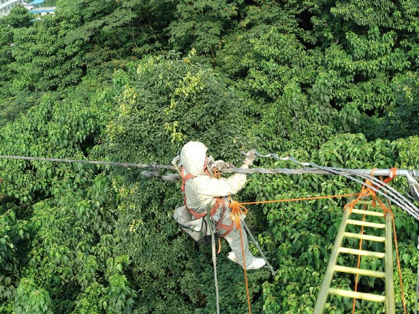 第一次爬塔時,田貴陽心里直打怵?!坝柧毜臅r候,師傅教我們不要往下看,往上看,看著腳釘往上爬?!爆F(xiàn)在,工作12年的他早已輕車熟路,120米高的過江塔,蹭蹭蹭六七分鐘就爬了上去。而上了塔工作才剛開始,要是碰上任務多,在半空一待就得五六個小時。