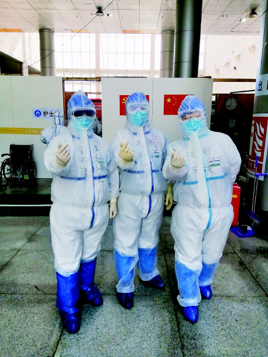 時秋(右一)與醫(yī)療隊隊員們穿戴好防護用品,成為了堅守在武漢江岸方艙醫(yī)院“紅區(qū)”的白衣戰(zhàn)士。(2月18日攝,受訪者供圖)