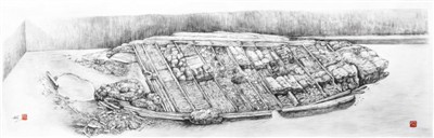 早期的考古現(xiàn)場都會采用帶有透視方法的素描速寫方法進(jìn)行現(xiàn)場記錄。半坡遺址、廣州南越王墓考古現(xiàn)場都曾專門請畫家到現(xiàn)場繪制素描圖。此圖繪制于2015年12月。作為現(xiàn)場發(fā)掘的參與者,作者負(fù)責(zé)現(xiàn)場測繪和畫圖的工作,每天都留意著沉船隨著發(fā)掘進(jìn)度而產(chǎn)生的變化。