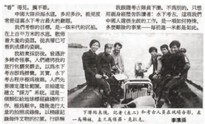 1990年定海水下考古培訓(xùn)時(shí),記者(照片左二)也曾下水,設(shè)法近距離觀察遺址狀況和隊(duì)員們的工作。崔勇(照片右一)是記者在水下的守護(hù)人之一。人民日報(bào)海外版也是最早詳細(xì)報(bào)道中國水下考古事業(yè)發(fā)展的新聞媒體。 (本報(bào)資料照片)