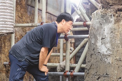 這張照片拍攝于2020年4月26日。考古隊(duì)員拍到了他們領(lǐng)隊(duì)崔勇做現(xiàn)場評估的場景。在沉船的外圍,已經(jīng)進(jìn)展到發(fā)掘外側(cè)反斜面位置,此時(shí)支護(hù)要預(yù)防船向下和向外的移位。支架太疏帶來風(fēng)險(xiǎn),太密則會影響發(fā)掘。 鄧嘉韶?cái)z